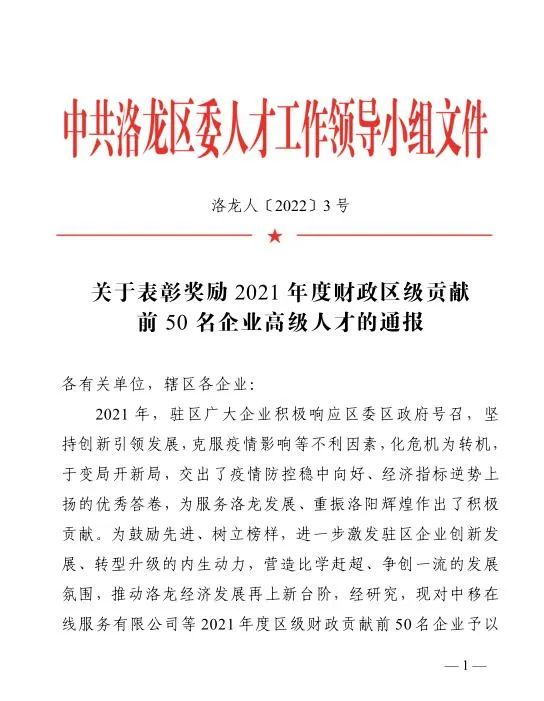 經過核對2021年度洛龍區(qū)級財政相關數據,洛龍區(qū)日前對中移在線服務有限公司等2021年度財政區(qū)級貢獻前50名企業(yè)予以通報表彰,并按規(guī)定對42家符合條件的企業(yè)進行***人才獎勵。